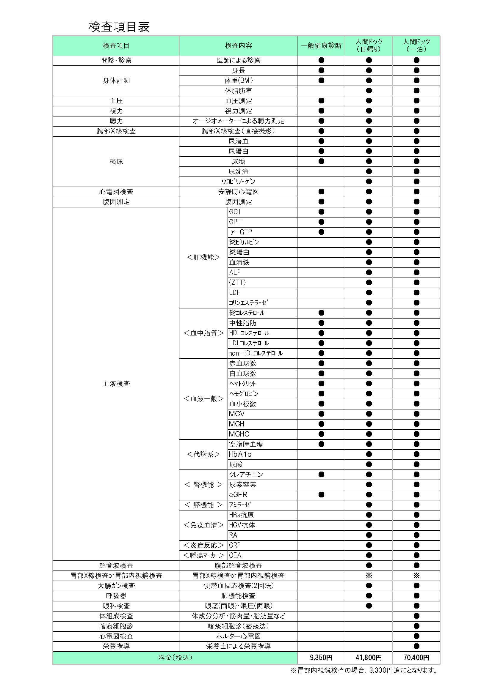 回答.ホームページ “コース” に健診項目・料金の記載がありますのでご参考ください。
