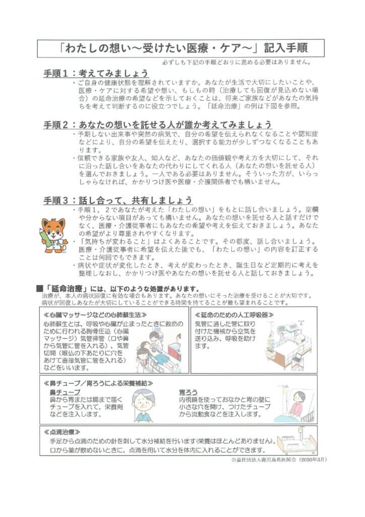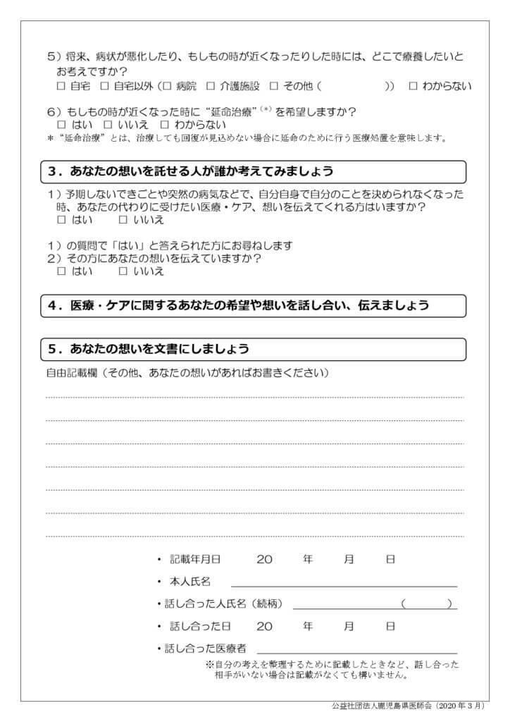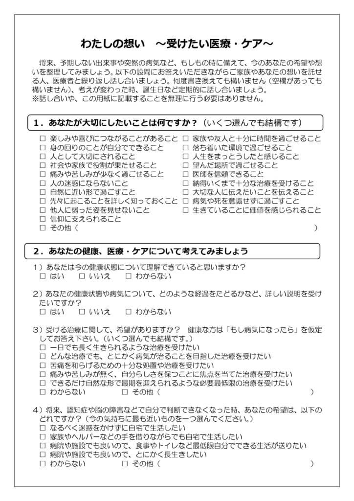 将来、予期しない出来事や突然の病気など、もしもの時に備えて、今のあなたの希望や想いを整理してみましょう。以下の設問にお答えいただきながらご家族やあなたの想いを託せる人、医療者と繰り返し話し合いましょう。何度書き換えても構いません (空欄があっても構いません) 、 考えが変わった時、誕生日など定期的に話し合いましょう 。