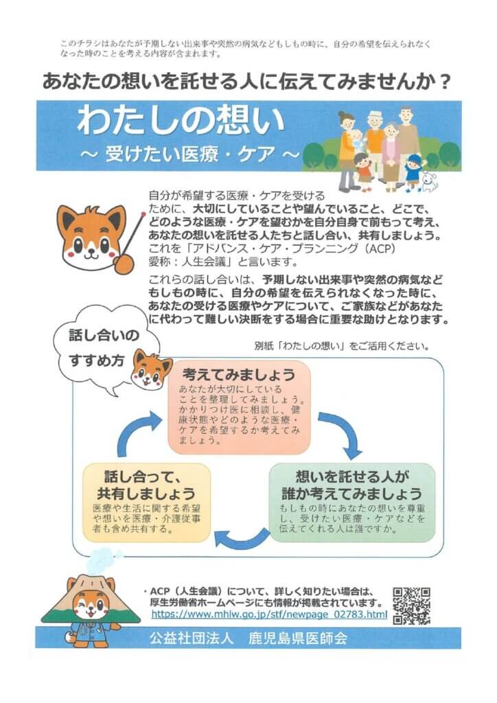 自分が希望する医療・ケアを受けるために、大切にしていることや望んでいること、どこで、どのような医療・ケアを望むかを自分自身で前もって考え、あなたの想いを託せる人たちと話し合い、共有しましょう。これを「アドバンス・ケア・プランニング(ACP)愛称:人生会議」と言います。