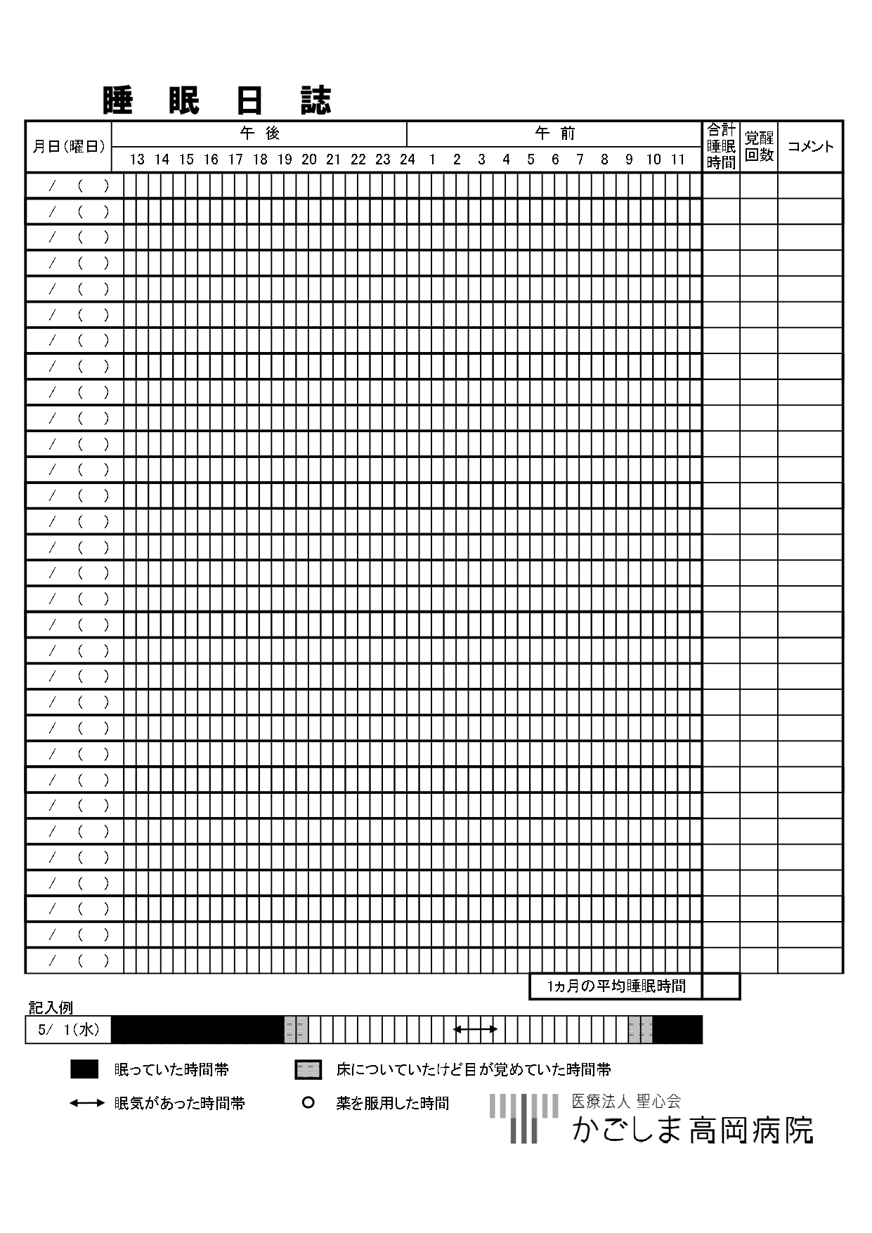 上記症状にて、睡眠専門医の診療に来院される際は、睡眠日誌を記入していただき、事前予約をお願いいたします。