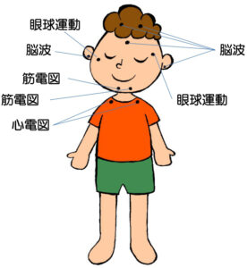 脳波や心電図、胸部の動き、血中の酸素量などの検査端子を体に取り付けて1晩寝て頂きます。痛みは全くありません。